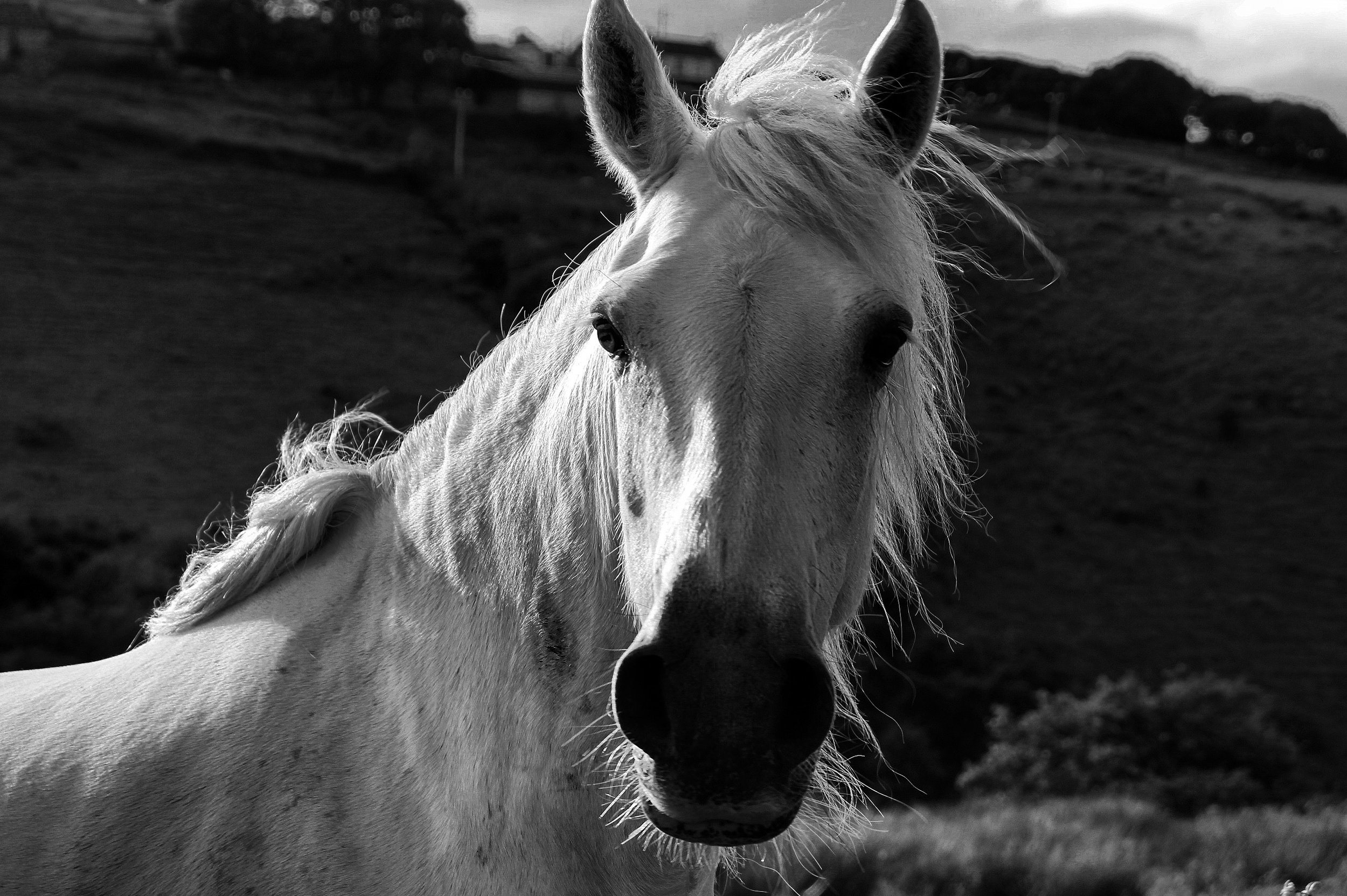 A white horse with a flowing mane standing outdoors in a hilly landscape with houses and trees in the background, in black and white. View fullsize