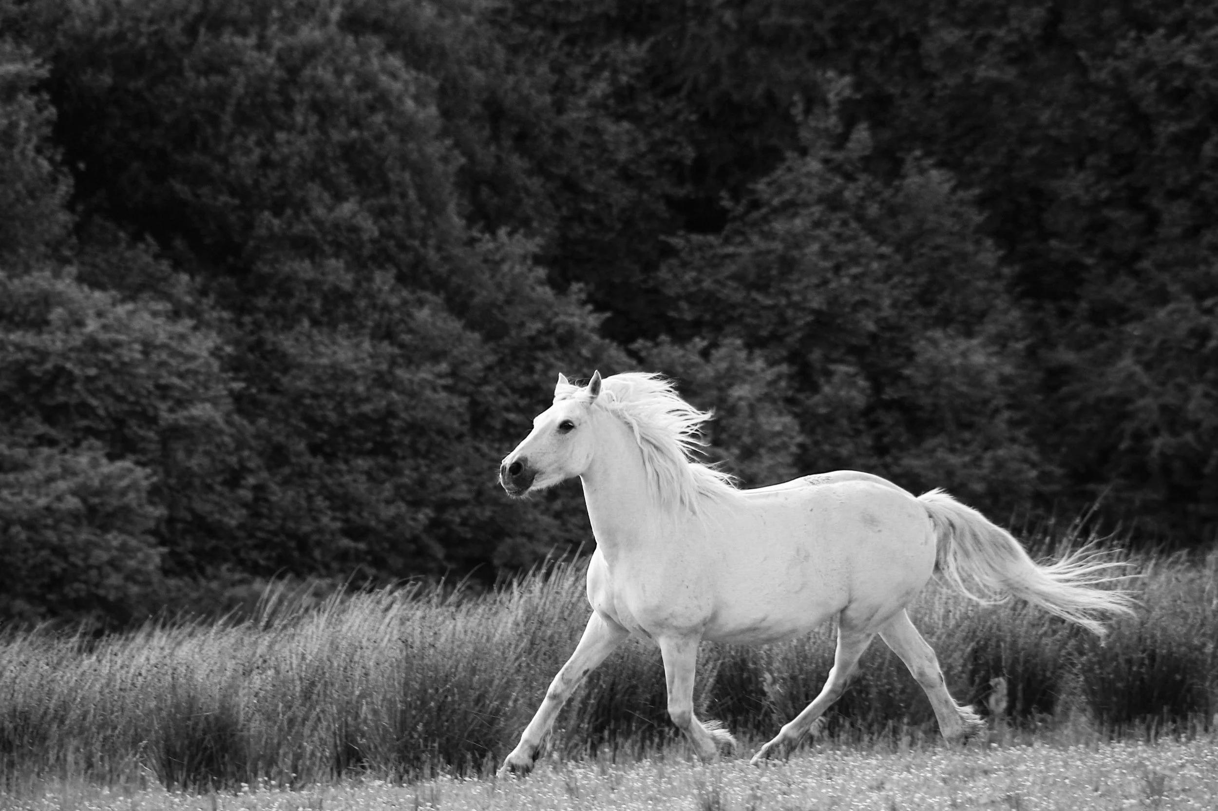 A white horse running in a grassy field with trees in the background, in black and white. View fullsize